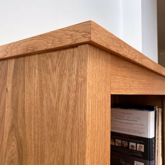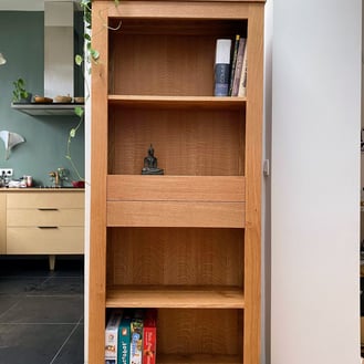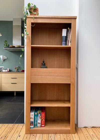 Après quelques ajustements pertinents, cette bibliothèque rustique et contemporaine est née. Sa finition à l'huile écologique Biofa vient sublimer la beauté du chêne français labelisé (FSC / PEFC) utilisé pour sa réalisation.
