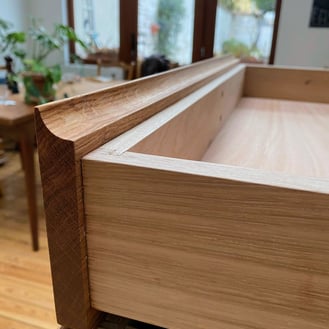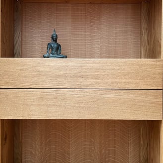 Ma cliente voulait une bibliothèque avec deux tiroirs centraux avec des rangements par dessus et par dessous. Elle avait également repéré quelques meubles du genre sur la toile, mais préférait engager un artisan local pour réaliser sa demande, et quelle bonne idée !