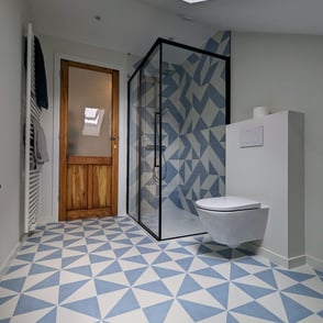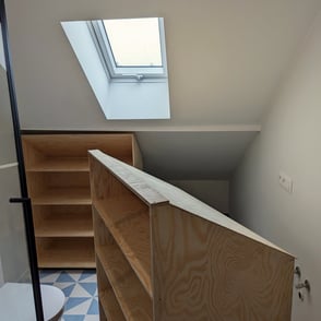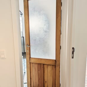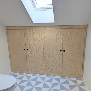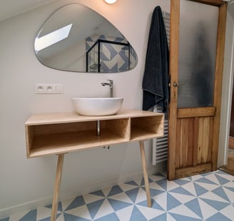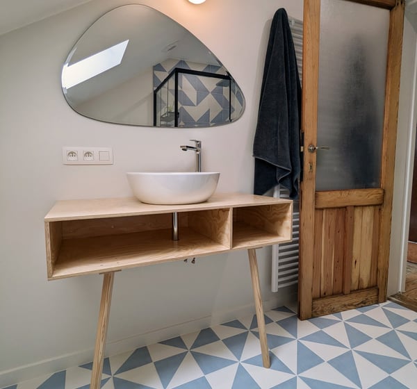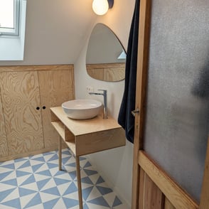 Le choix du multiplex de sapin de Pologne fait écho à l'ancienne porte de jardin en pitchpin devenue la porte d'accès à cette salle d'eau. Il amène également beaucoup de "lumière" tout en réchauffant l'espace.