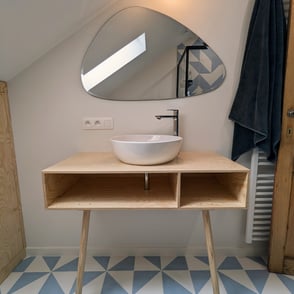 Les 12mm d'épaisseur du multiplex labelisé FSC / PEFC répondent aux critères écologiques en utilisant moins de ressources qu'avec du 18mm, tout en respectant les exigences d'une salle de bain. La restauration et l'utilisation d'une vieille porte de presque 100 ans, l'utilisation de vernis (meubles) et d'huile (porte) écologiques Blanchon viennent conforter l'atmosphère saine de ce petit havre de paix.