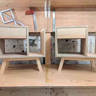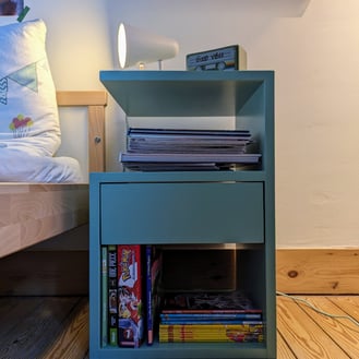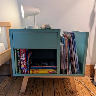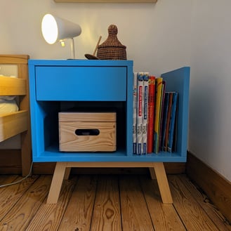 Colorées, modulables et écologiques, ces tables de nuit ont été fabriquées avec 100% de chutes de bois présentes dans mon atelier. Une verte et une bleue pour deux frères adorables et inséparables !