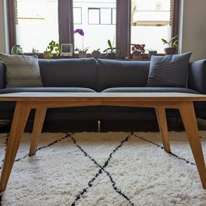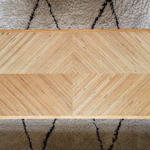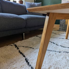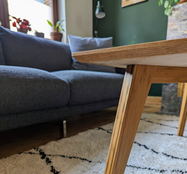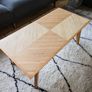 Chinée en partie dans des conteneurs de déchets bois, cette table de salon au style scandinave a été fabriquée avec 100% de bois de de récup ! Des morceaux de bambou pour les pieds, du "baubuche" maison réalisé avec des baguettes de multiplex de bouleau pour le plateau et de fines languettes de chêne biseautées pour souligner le tout.